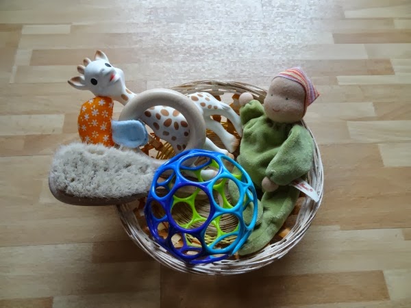 Im Moment übt B.enno das Greifen und in den Mund schieben, er betrachtet und befühlt Gegenstände ausgiebig. Dafür hat er viele unterschiedliche Dinge, Spielsachen und Alltagsgegenstände wie eine Feuchttücherpackung oder seine Baby-Haarbürste. Montessori für Babys sozusagen. :)